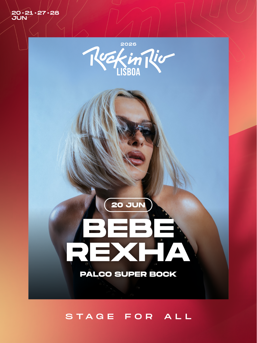 - UMA DAS MAIORES HITMAKERS DA CENA POP GLOBAL, BEBE REXHA ESTREIA-SE EM PORTUGAL E NO ROCK IN RIO LISBOA A 20 DE JUNHO COMO HEADLINER DO PALCO SUPER BOCK, NUMA ATUAÇÃO QUE REFLETE A SUA NOVA FASE ARTÍSTICA MARCADA PELO PROJETO “DIRTY BLONDE”;