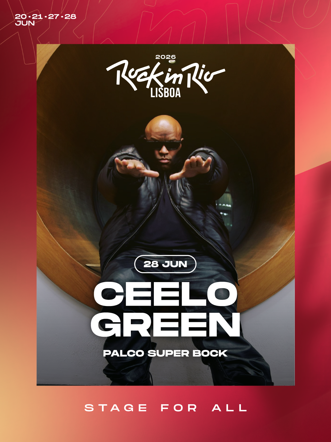 - VENCEDOR DE VÁRIOS GRAMMY® E UMA DAS FIGURAS MAIS MULTIFACETADAS DA MÚSICA E DO ENTRETENIMENTO, CEELO GREEN REGRESSA A PORTUGAL 13 ANOS DEPOIS PARA ATUAR, PELA PRIMEIRA VEZ, NO PALCO SUPER BOCK DO ROCK IN RIO LISBOA A 28 DE JUNHO, NO DIA MAIS URBANO DA HISTÓRIA DO FESTIVAL;